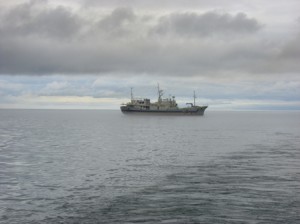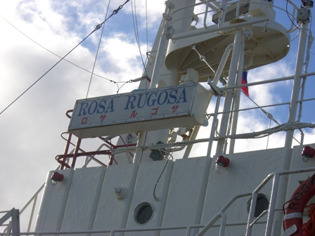 五日間お世話になる我々のねぐら、“ROSA RUGOSA”(500トン)という船にて根室港を7/1出発して4時間で国後島に到着しました。